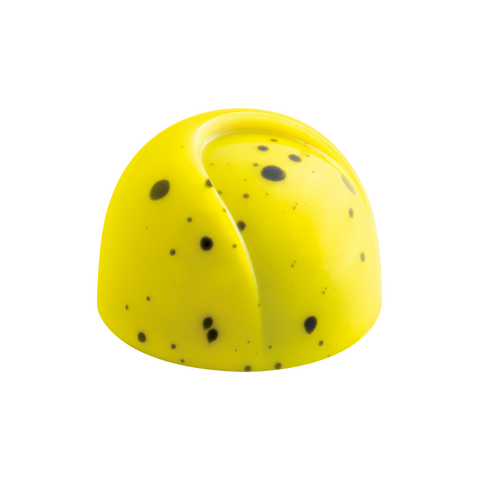 Ce dôme de chocolat blanc dévoile un cœur de coulis de passion aux saveurs tropicales.